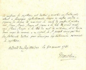 A placer dans le contexte de la guerre d'indépendance américaine. "Le vaisseau Le Sagittaire est destiné a escorter les Batiments allant à l'amerique séptentrionale". Il donne des instructions quant aux signaux à arborer lorque le "Sagittaire" voudra se séparer de l'armée du comte de Grasse. Avec le "Sagittaire", vaisseau de 50 canons, le chevalier de Montluc (1746-avant 1827) participa à l’escorte du convoi accompagnant l’escadre du comte de Grasse du 8 au 20 avril 1782.