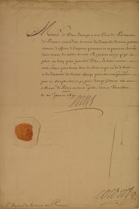 Document sent to Le Bret “President du Parlement de Prouence”. On the designation of “offices d’experte priseur et arpenteur jurés dans toutes les villes de mon Royaume”.