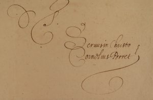Joined : Porret, Cornelius – Autograph letter, in Latin, to Balthasar Moretus (Antwerp), Louvain, 8 July 1637, paper, c. 31 x 20 cm, 7 ll., brown ink. Inc.: “Amantissime d(omi)ne cognate”. Expl.: “Seruus in Christo, Cornelius Porret”. Address on verso: “Ornatissimo Viro D(omi)no Balthasari Moreto Typographo Regio, Antuerpiae”. With wax seal of the “Rect(or) Coll(egii) Lovan(iensis) Societ(atis) Iesu”. (3 pcs)