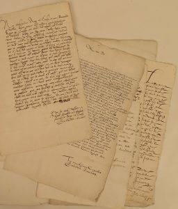 numbering in left top corner): 1a. Guillaume Riviere to Jan Moretus, 1595; 1b. Idem to Balthasar Moretus (?), 1611 (Latin). - 2. Nicolas Offermans to B. Moretus, 1654. - 3. Joannes Baptista Offermans to B. Moretus, 1656. - 4. Elysabet van Hoinssem (?) to J. Moretus, 1601. - 5. Jean de Flandres to J. Moretus, 1594. - 11 (= 6)a-b. Jehan Nieulaet to J. Moretus, 1594 (2).