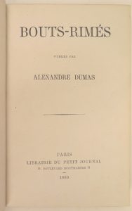 collaborateur Joseph Méry les vers, Dumas eut l'idée de lancer un concours de bouts-rimés utilisant les mêmes rimes auprès des lecteurs du "Petit Journal". Le succès fut tel et la demande si importante qu'il proposa aux 200.000 lecteurs de la revue une publication par souscription d'un franc. S'il obtenait 500 frs, il ferait un volume avec tous les poèmes reçus. A noter que certains des poètes amateurs s'essayèrent aussi à l'acrostiche... Selon Vicaire, chaque vol. doit porter une dédic. aut.s. de Dumas (i.e. une formule stéréotypée "Avec mille complimens"), absente dans notre ex. Ref. Vicaire III-428. Bn-Opale plus. www.dumaspere.com › Œuvre › Dictionnaire des œuvres.