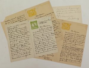 4 lettres aut.s. à Paul Lacomblez, [Anvers], entre c. 1893 et 1898, 4 doubles ff., in-12, 2 en-têtes gravés sur bois : 1 tiré en jonquille et l'autre à la marque de sa presse "L'Alouette", tiré en vert pomme. Un petit manque angulaire et qqs...