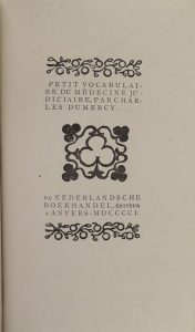 Petit vocabulaire de médecine judiciaire. "Anvers, De Nederlandsche Boekhandel" Edition originale tirée sur "L'Alouette", la presse privée du poète, et ill. de 8 bois tirés en noir et 1 en vert. Tirage à 100 ex. num. Un des 15 de tête sur...