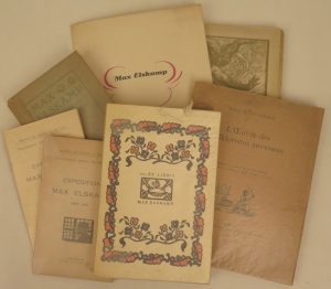 Joint, in-8 ou in-4, br. : L'Eroica. Rassegna d'ogni poesia. La Spezia, s.n., [1914]. Num. spécial de cette belle revue consacré à "Gli xilografi del Belgio", ill. de nombr. bois d'artistes belges dont Elskamp (manque celui de Tytgat). - Piérard, Louis - Un poète de la vie populaire : Max Elskamp. Orné de bois gravés par M. Elskamp. Bruxelles, Paris, Van Oest, [1914]. 1/300 n. sur hollande. - De Bosschère, Jean - Max Elskamp. Essai. Avec 12 reprod. de bois (...). Paris, Bibliothèque de l'Occident, 1914. Dédic. aut.s. à Hugo van Walden. - Van Heurck, Emile - L'oeuvre des folkloristes anversois. Augmenté de quelques bois de Max Elskamp. Anvers, Buschmann, 1914 (rouss.). - Exposition Max Elskamp, 1862-1931. Bruxelles, Bibl. royale, 1932, 2 ex. - De Schuyter, Jan - Max Elskamp. Anvers, Boekuil- en Karveel uitgaven, 1943. 1/65 ex. n. - Sadeleer, Pascal de - Max Elskamp poète et graveur. Catalogue raisonné (...). Bruxelles, Simonson, 1985. Ex. de passe sur vélin de Hollande contenant le tirage d'un bois d'Elskamp et un portrait à la pointe sèche par C. Chapelle. (9 vol.)