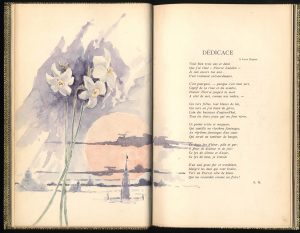 Edition originale constituée d'un tiré à part h.c. de "La Jeune Belgique" (mars 1887), avec nouveaux faux titre et titre, repagination et le f. de dédicace recomposé. La 1ère édition en librairie paraîtra en 1891 chez Lacomblez. Tirage à 130 ex. num. Un des 10 de tête sur japon (n. 9). Ex. enrichi par le peintre et illustrateur belge Léon Dardenne (1865-1912) d'une trentaine de compositions originales aquarellées de dimensions variables (pleines pages, doubles pages, in texto...), dispersées dans l'ensemble du texte et sur la 4e de couv. Compos. de la p. 51 signée et datée mai 1887, celle de la p. [52] redatée, celle de la 4e de couv. monogr. et datée. Dédic. aut.s. de Léon Dardenne (nom du dédicataire gratté) "de Pierrot noir à Pierrot blanc" (Albert Giraud lui-même, auteur de plusieurs recueils sur le thème du Pierrot ?). Le poète et l'artiste collaborèrent tous les deux à "La Jeune Belgique". Jolie et fantasque illustration aux tons délicats. Ex-libris Gustave J. Nellens.