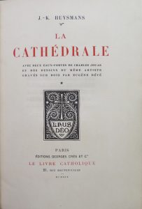 Nouvelle édit. (1ère 1898). Ill. de 2 frontisp. à l'eau-forte et de bandeaux et culs-de-lampe sur bois pour chaque chapitre. Ex. num. sur vélin de Rives (n. 622). En 1909, Ch. Jouas avait déjà illustré ce 2e volet de la "trilogie de la conversion" (avec "En route" et "L'oblat") qui met en scène le personnage de Durtal, double littéraire de l'auteur. Ex. fort joliment relié. Ex-libris Robert Maréchal.
