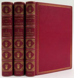 De la "Petite Bibliothèque artistique". Ill. de 12 eaux-fortes hors texte dont 3 placées en frontisp. Ex. du tirage non num. sur hollande. "Chansonnier né à Roubaix le 20 février 1820, mort à Paris, dans la presque misère (parce qu'il a toujours refusé les cachets), le 24 avril 1893. Dans la misère, oui, mais pas méconnu : le très sérieux New York Times (entre autres), dans un article publié  quelques jours après sa mort, signala sa disparition en des termes fort élogieux... et ce, à un moment où on avait déjà cessé de compter le nombre de volumes publiés sous son nom : romans, pièces de théâtre, opérettes de salon, récits de voyage et même poèmes que, souvent, il mettait lui-même en musique. Les thèmes traités par Gustave Nadaud furent divers et contribuent, encore aujourd'hui, à refléter l'histoire, la politique, la vie quotidienne de son époque" (Du temps des cerises...). Ex. bien relié par le Parisien G. Malraison qui exerça fin XIXe-début XXe s. Ex-libris Robert Maréchal.