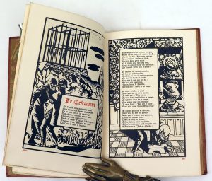 "Magistrale édition" (Carteret) illustrée de doubles pages en noir. Tirage à 967 ex. num. Un des 810 sur vergé d'Arches (n. 278). Belle typographie composée dans la gothique bâtarde gravée par Jean du Pré en 1489 pour les Heures à l'usage de Rome. Texte établi par Auguste Longnon et revu par L. Foulet, contenant les lais, le testament et les poésies diverses. Belle édition tirée en noir et rouge.