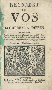 Reynaert den Vos ofte Het oordeel der dieren, in het welk Koning Lion en zyne Heeren, de schalkheyd van Reynaert den Vos onderzogt en geoórdeelt word (…). Verçiert met 28 schoone plaeten. Rare ed. of the popular Flemish adaptation of Reinaert....
