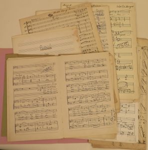 Muziek van de Vlaamse componist P. Aerts (1912-1996). Het merendeel gesign. door de componist, enkele met opdracht aan Paul Van den Abbeel. O.a. : "Für Renate Hahn. Mit deinen blauen Augen", "Am Theetisch", "Sommerabend", , "Der Schmetterling", "Das Herz ist mir bedrückt", "Pastorale. Cello en klavier", "Mein Garten", "O Nacht!", "Improvisaties op het oude volkslied Ick sagh Cecilia komen", "Jan zou uit vrijen gaan", "In je witte klaad", "Missa Angelorum", etc. Bijgevoegd : "Kinderliederen" door Peter Aerts. Bundeling van een 20tal liederen. - 2 notities. - Enkele partituren in kopie.