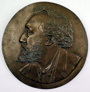 Peter-Benoit 1834-1901. Médaillon en terre cuite, diam. 18,5 cm. - Sans inscription. Grand médaillon en métal moulé (laiton ?), diam. 33,5 cm. Le compositeur en veston et lavallière. - Id. Sculpture en bas-relief, albâtre, 24 x 22,5 x 4,5 cm.