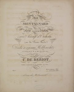 Bériot, Ch. de - Trois duos pour 2 violons. Op. 57. S.l., s.n., s.d. (PN 2426), 7, 9, 9 pp. - Id. - Air varié pour le violon avec accompagnement de second violon, alto, basse ou piano. Paris, Troupenas, s.d. (PN 160), 9 pp. - Id. - Air varié pour le violon. Avec accomp.t d'orchestre ou piano. Op. 3. Mainz, chez les fils de B. Schott, s.d. (PN 7019), 12 pp. - Id. - Air Montagnard, varié pour le violon avec accom.t d'orchestre (ou du piano forte). Op. 5. Bonn, Simrock, s.d. (PN 2539), 13 pp. - Id. - Cinquième air varié [en mi. Avec accomp.t. d'orchestre]. Op. 7. S.l., s.n., s.d. (PN 215), 14 pp. - Id. - Sixième air varié pour le violon avec accompagnement d'orchestre ou piano. Oeuv. 12. Mainz, chez les fils de B. Schott, s.d. (PN 3242), 11 pp. - Id. - Septième air varié pour le violon (...). Op. 15. Paris, Dépôt Cental de la Musique, s.d. (PN 394), 11 pp. - Id., Osborne, A. - Fantaisie brillante sur Guillaume Tell, de Rossini, pour violon et piano. Op. 16. Paris, E. Troupenas, s.d. (PN T 336), 19 pp. - Id., Labarre, Th. - Deux duettini pour piano et violon sur le Stabat de G. Rossini. Op. 40. Ibid., s.d. (PN T. 1205), 9 pp. - Id., Osborne, A. - Duo sur le domino noir. Op. 31. S.l., s.n., s.d. (PN L. 943), 15 pp. Bériot (1802-1870) was a Belgian violinist and composer. His great amount of violin music is still of use for violin students.