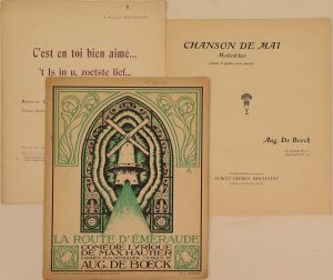 Chanson de mai = Meiliedeken. Choeur à quatre voix mixtes. Brux., Schott Frères, 1920 (PN S.F. 5699), 11 pp. - C'est en toi bien aimé... = 't Is in u, zoetste lief... Poème de Ch. Van Lerberghe. Version flamande de M. Sabbe. Brux., Lauwereyns, s.d. (PN F. 767 L.), 6 pp. - La route d'Emeraude. Comédie lyrique de Max Hautier d'après Eug. Demolder. Brux., Pleintinckx, 1922, (PN J.P. 537), 6 pp. - Het lied van den leeuwerik. Koor voor twee gelyke stemmen (...). Brux., Maison Beethoven, s.d. (PN G.O. 162). - Mélodies. 1. O, ses pas incertains. 2. Elle a cueilli des fleurs. Brux., Maison du Conservatoire, P. Pletinckx, s.d. (PN J.P. 526, 527). - Menuet pour piano. Leipzig, Breitkopf & Härtel, s.d. (PN 29545). On joint : In memoriam Aug. De Boeck 1865-1937. Programme de l'hommage national donné par l'Orchestre National de Belgique.