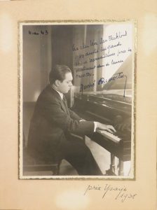 Black and white portrait of Dumortier playing the piano by the significant Armenian photographer Aram Alban (1883-1961). With dedication to L. Van Eeckhout for his "dévouement dans des heures cruelles". At the bottom in another hand "prix Ysaye 1938".