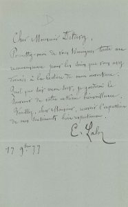 1. 8/03/1877, demande de venir entendre la répétition d'une scène d'opéra. 2. 17/09/1877, remerciement à Deldevez pour son "extrême bienveillance" pour les soins qu'il a donnés à la lecture d'une de ses ouvertures. 3. 21/09/1877, remerciement à Deldevez pour "être reçu pour l'un de vos concerts". 4. 2/?/1880, concernant une demande d'audition pour son ouverture du "Roi d'Ys". 5. 10/10/1880, joie pour une lettre officielle de la Société des Concerts après une première répétition de son Allegro (Appassionato Symphonique). 6. 6/04/1881, Lalo ne peut être présent au rendez-vous car il est malade. De 1872 à 1885, E. Deldevez (1817-1897), violoniste et compositeur français, dirigea la Société des concerts du Conservatoire et réserva une place importante à Lalo. On ajoute une petite carte de visite aut.s. (initiales).