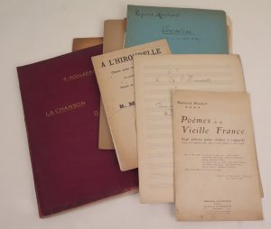 Verzameling handgeschreven en enkele gedrukte partituren. O.a. "A l'hirondelle", samen met een gedrukte uitgave van 1896, opdracht op titelblad, "Vocalise en forme de valse", "L'eau passe" (1952), "Chanson de Flandre", "Vlaanderenland", "Au...