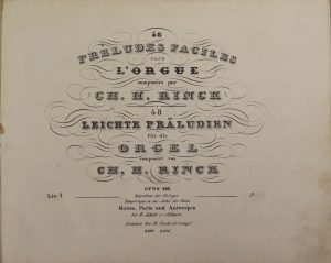 Rinck, Ch.H. - 48 préludes faciles pour l'orgue. Op. 116. Mainz, Schott's Söhnen, s.d. (PN 4399), 19 pp. First 24 préludes only of this rare 1st ed. by Rinck (1770-1846), German composer and organist. - André, J. - Zwölf kurze und vermischte Orgelstücke mit und ohne Pedal zu spielen. Mainz, Schott's Söhnen, s.d. (PN 4256), 9 pp. - Rinck, Ch.H. - Introduction mit 4 leichten Variationen und Finale für die Orgel über ein Thema von Corelli. Mayence, chez les fils de B. Schott, s.d. (PN 3924), 9 pp. - Id. - Sechs Chorale mit mehreren Veränderungen für die Orgel. Op. 40. Mainz, Schott, s.d. (PN 947), 28 pp.