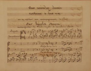 Gamba, P. - "Un essere solo (...)". Autogr. signed notation, 25 x 18,5 cm, 1950. Gamba (°1936) is an Italian orchestral conductor and pianist. - Milhaud, D. - "Magali". Music manuscript, s.d., 8 pp. Stamp on 1st p. - Blumenthal, J. - Autogr. signed music manuscript, 1865, 19 pp. Signed at the end by the composer. - Suggia, G. - "Duas carreiras (...)". Autogr. signed notation, 25 x 18,5 cm, Porto, 21/09/1937. In another handwriting : "Aubrey Rainier". Suggia (1885-1950), Portuguese cellist with international reputation. - Grimm, C. - Autogr. signed short music notation, 14 x 11 cm, pasted on a larger paper, 22 x 14 cm, Ansbach, 18?5. Grimm (1820-1882), German harpist and composer. - Maton, A. - Autogr. signed short music notation, 27 x 17 cm, Paris, 21/08/1870. - Letorey, O. - Autogr. signed music notation, 29 x 19 cm, Rome, Febr. 1898. Letorey (1873-1938), French composer. - Monpou, H. - "Vous reviendrez demain". Autogr. music manuscript, Dec. 1821, 26,5 x 20,5 cm, pasted on 3 red thick 4to-size papers. Monpou (1804-1841), French composer and organist. - 8 other small music manuscripts of which some autogr. signed.