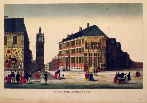 Vue de l'hôtel de ville à Gand. Very nice view showing the city hall and people enjoying a performance of a street singer.
