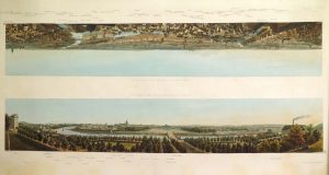 Panorama von Paris. Handcoloured aquatint, Paris, Frédéric Martens, c. 1834, 51 x 99 cm; printed caption. Intact copy kept in the orig. tube (sl. soiled, bottom gone) covered with gilt paper, oval gilt green title label. Very nice pl.