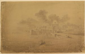 2 lavis tekeningen, 18de e., Ongeïdentificeerde vestingstad vermoedelijk Antwerpen of Breda samen met ongeïdentificeerd slot.