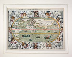 Double-page woodcut map, German text on verso, with glossary of Latin words. This new world map was prepared for the 1550 ed. of Münster's "Geographia", replacing the map which had appeared in editions of the "Cosmographia" and "Geographia" from 1540 onwards. It is an oval projection surrounded by clouds and wind-heads with their names in banners. In the oceans are depicted wales & sea monsters. The continents are in rough outline. In the lower left corner the woodcutter's initials DK (David Kandel).