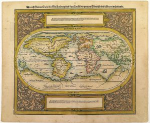 1. Attractive oval woodcut map showing the "modern" world in the later issues of Münster's "Cosmographia". Title in gothic. Corners decorated by a florid vine leaf patern. 2. Fair example of Munster's second ancient map of the World, based upon the writings of Ptolemy. The traditional classical world is surrounded by clouds and 12 wind-heads (their Latin names in banners). The continents have unexpected shapes and are all connected by a great southern continent, "Terra incognito secundum Ptolemaeum". Sharp & clean copies without a heavy shining through of verso as usual.