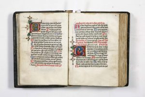 Decoration: rubricated in red/blue throughout; 2 five-line gilt initials (one with King David); numerous 2-line and 5-line initials in red/blue with penwork extending into the margin. Pasted on front flyleaf : drawing of an angel, c. 9,5 x 4 cm, on vellum, cut out of another ms., in blue and red with a gilt halo. Contents: [1]v-[3]v "Ratio ad invenie(n)du(m) pasca (...)", dated 1487; [4] blank; [5]r-[10]v Calendar (Rome); 1r-142v Psalterium; 143r-163r "Hymni per totum annum"; 163v-178v Offices of the Holy Virgin, and of the Dead; 178v-181v 7 Psalmi Penitentiales + Litany; 182r-188r Kyrie, Antiphona, Hymni; 188r-192v Officium Sanctae Crucis; 193r-208v Missa; 209r-223v Confessionale Magistri Ioannis Viterbiensis; 224r-235 blank (but for 2 ll on f. 234r).