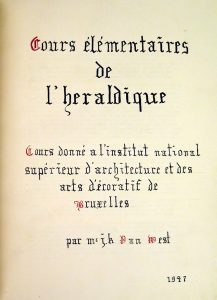 "Cours élémentaires de l'heraldique. Cours donné à l'institut national supérieur d'architecture et des arts décoratifs de Bruxelles par Mr J.K. Van West. 1947". Dactylographie illustrée avec titre ms.,