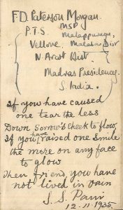 Personal notebook of an English (?) resident in Southern India, with alphabet exercises and wordlists in what is most probably Telugu (instead of Hindi like mentioned in our printed catalogue) with English trsls. A few pp. with notes on daily expenses, etc. On f. 1r ownership entries, i.a. "F.D. Paterson Morgan" Madras 1935.