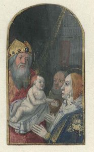Two sets : 1. 2 larger, c. 7 x 4 cm, top rounded and 15 smaller, square, c. 2,2 x 2,2 cm, miniatures, touched with gold, cut from a French manuscript [Northern France? Low Countries?; late 15th c.?], probably a Book of Hours. The larger miniatures show the Circumcision of Jesus and a Nativity scene (shepherds near a fire looking at a comet), the small square ones represent saints, mostly in blue or yellow, i.a. Sebastian, Christopher, Andrew, Barbara, Stephan, George, Gregory, Peter. 2. Six letters from a gothic alphabet [Low Countries?, c. 1500?], on paper, c. 4,5 x 3,5 or 4 x 3 cm, cut from a liturgical manuscript. Written in brown ink, with a blue or pale green background; 4 initials with expressive, somewhat grotesque, faces.
