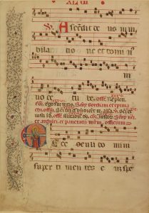 Decoration : 1 initial in blue with red penwork, late 15th. c. and 1 initial later historiated in neo-gothic style with penwork extending into a flowery border strip, c. 41 x 4 cm. In good condition.