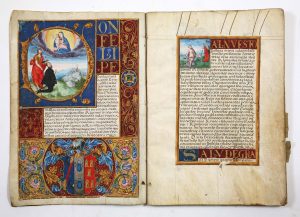 thick coloured ribbon, [36] ff., 38-39 ll., expertly written in brown/black ink, and ruled in yellow border. In very good condition. The "Carta" was ratified at Montalban on 24 October, and at Maceda on 29 October 1579. Illumination: F. 1v with large illuminated initial "D" showing a nobleman and St John the Baptist praying to the Holy Virgin; at bottom the elaborately gilt coloured coat-of-arms. F. 2r with a small coloured drawing of Ribadeneyra’s patron saint Jerome.