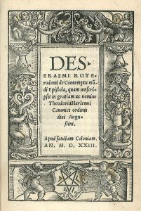 Early ed. of Erasmus’ 1st work, which was only published late in his career (1st Louvain 1521). It is a sincere plea in favour of true monastic life, written at the age of 20, and dedicated to a fictitious “Theodoricus Harlemius”. Title within elaborate woodcut border.