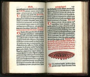 Apparently unrecorded (?) illustrated early Venetian Hours of the Virgin (Use of Rome). Woodcut ills : 11 full-page, 11 large historiated initials, 2 half-page and 83 small woodcuts. Entirely printed in red and black. Woodcut mark at the end. 17th-c. armorial bookpl. with device "Patriae et Amicis" (probably a member of the Nürnberg patrician family Pfinzing von Henfenfeld).