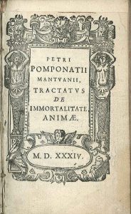 Probably a 17th-c. French ed. of the famous treatise on immortality (1st Bologna 1516) by the Italian philosopher P. Pomponazzi (1462-1524), backdated to foil the censor. “His doctrines on immortality, first set forth in "De immortalitate", occasioned cries of outrage from prominent philosophers and theologians and produced the immortality controversy, one of the most important debates prior to the Reformation” (DSB XI 74). Title within woodcut border.