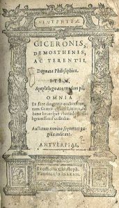 We join : Sententiae Ciceronis, Demosthenis, ac Terentii. Dogmata philosophica. Antw., Chr. Plantin, (31 October) 1572, 16mo, old calf, spine on 3 raised bands (rubbed, front joint split), [32]-478-[2] pp. (pp. 1-2 for the larger part torn out; title stained, some traces of use, last f. underlaid). Extensive collection of classical quotations. Title within woodcut border. Names on front flyleaf. Schoolboy’s scribbling. Ref. BT 4322. Voet (Plantin Press) 987. Pettegree NB 8172. Not in Adams, Sorgeloos, STC Dutch (BL). (2 vol.)