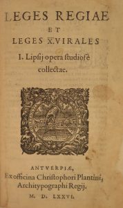 Extr. rare (2nd recorded copy?) Plantin ed. of what was probably Lipsius’ inaugural course of ancient history at Louvain University. It consists of an edition of the oldest Roman legislation, together with a few notes. Woodcut mark on title.