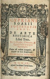 De arte rhetorica libri tres ex Aristotele, Cicerone, & Quinctiliano precipue deprompti. Rome repr. of a treatise on rhetoric by the Spanish Jesuit C. Suárez (1524-1593), 1st publ. Coimbra 1560. Title in red and black within woodcut border....