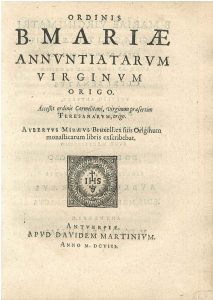 Rare early history of the Annuntiates and the female Carmelites by the famous ecclesiastical historian Miraeus (1573-1640). Woodcut device on title.