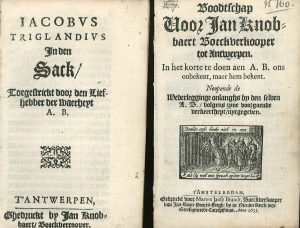 3 extr. rare pamphlets on a short war between the Amsterdam anti-Remonstrant preacher Jacobus Trigland (1583-1654) and the Antwerp publisher Cnobbaert. 1. In gothic and roman type. Ref. Not in Anet, STCV, BL, BnF. 2. Woodcut on title. In gothic type. Ref. Not in Anet, STCN, BL, BnF. 3. Woodcut on title. In gothic and roman type. Ref. STCN (1). Not in BL, BnF.