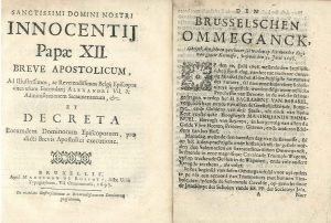 Joined : Innocentius XII - Breve apostolicum ad (...) Belgij episcopos circa usum Formularij Alexandri VII. & administrationem sacramentorum (...). Brussels, M. van Bossuyt, 1697, 4to, disbound, 14-[2] pp. (age-toned). Very good copy. Large woodcut mark on p. [15]. Ref. Not in STCV, Opac KBR. - Lettre ecrite d’Anvers le 29. Decembre 1700. (...) au sujet du Testament de Charles II. Roi d’Espagne. [Brussels, s.n., 1701], disbound, 12 pp. Ref. Not in STCV, Opac KBR. Cp. STCN (other ed.). - De par le roy. [Brussels, s.n., 1697], sm. broadsheet (stained). (4 vol.)