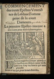 [Amboise, Michel d' - Les Epistres veneriennes de Lesclave Fortune (...)]. S.l., s.n., s.d. [milieu XVIe s.], in-16, veau blond XVIIIe s., triple cadre fil. doré sur les plats (coins émoussés, petit défaut en tête), dos lisse à compartiments armoriés dorés (coiffe sup. défect.), tr. dorées, [81] ff. (manquent A1-4, B8, C8 et I8 (bl. ?); rogné très court en tête, bruniss. d'usage). Edit. non ident. ill. de 30 petits bois in texto. Au f. A5 "Commencement des trente Espistres Venerie[n]nes de Lesclave Fortune prive de la court Damours". - La muse folastre. Recherchee des plus beaux esprits de ce temps. De nouveau (...) augmentee. Lyon, Thibaud Ancelin, 1607, 3 part. en 1 vol., in-12, vélin souple de l'époque (abîmé, quasi détaché), 77 (manque A2), 59 (sur ?, manquent ff. 4-10 et la fin), 59 (= 60, titre manquant) ff. (importantes traces d'usage, mouill. variables passim). Rare édition (1ère à Rouen en 1603 ?). Contient des textes facétieux en vers par Béroalde de Verville, Pierre de Ronsard (9 "folastries"), Paul de l'Ecluse, etc.