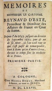 Memoires de Monsieur le Cardinal Reynaud d'Este, protecteur & directeur des affaires de France en Cour de Rome. Depuis l'an 1657. jusques au dernier de Septembre 1673 (...) où l'on void tout ce qui s'est passé de remarquable, tant a Rome qu'en...