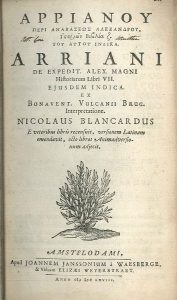 Peri anabaseos Alexandrou [Greek] De expedit. Alex. Magni. Ejusdem Indica. Ex Bonavent. Vulcanii Brug. interpretatione [ed.] Nicolaus Blancardus. Arrianus’ history of Alexander the Great, in the Latin version of B. Vulcanius (1538-1614), and with...