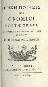 Joined : Aelianus - Varia historia (ed. Jacobus Perizonius). Leiden, J. du Vivié & I. Severin, 1701, 8vo, vellum, [66]-522 pp., engr. front. - Id. - Idem. Strasburg, J.R. Dulssecker, 1713, 8vo, vellum, [24]-825 pp. + Index, engr. front. - Ethike poiesis [Greek] sive Gnomici poetae Graeci [ed. R.F.Ph. Brunck]. Strasburg, Heitz, 1784, 8vo, sheep, vj-349-[1] pp. - Orphica. Procli Hymni. Musae Carmen de Hero et Leandro. Callimachi Hymni et epigrammata. Leipzig, Tauchnitz, 1829, 256 pp. - Hippocrates - Aphorismi [ed. Anna Car. Lorry]. Paris, Barrois, 1784, 12mo, half vellum, red edges, xx-353-[1] pp. Good copy. Greek with facing Latin trsl. (6 vol.)