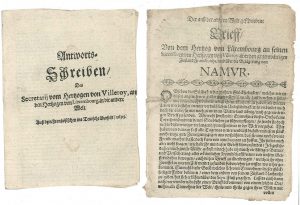 Joined : Antworts-Schreiben/ des Secretarij vom Hertzogen von Villeroy an den Hertzogen von Lüxembourg, in die andere Welt. [Germany, s.n., 1695], 4to, uncut as issued, [2] ff. (somewhat short, folds). Good copy. Ref. Not in VD-17, Opac KBR. (2 pcs)