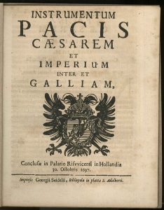 Instrumentum pacis Caesarem et Imperium inter et Galliam, conclusae in Palatio Riswicensi in Hollandia, 30. Octobris 1697. Rare Breslau ed. of the text of the Treaty of Ryswick, settling the Nine Year’s War between France (Louis XIV) and the Great...