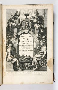 Monumental ed. of the complete works of Lipsius (1547-1606), with an extensive subject index. Engr. ills :  front. by C. Galle after P.P. Rubens, portrait of Lipsius by Th. Galle, Vol. III with some 73 pls, incl. 2 double-page views (Louvain, Heverlee) and numerous text engravings of Roman antiquities, crucifixion scenes, Church and view of Halle etc. Engr. and woodcut marks. Title in red & black. Cont. Antwerp Jesuit ownership entry on titles "dono d. typographi". Heraldic bookpls Le Candele, Rob. Bibauw.