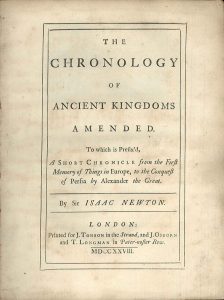 The chronology of ancient kingdoms amended, to which is prefix’d, a Short chronicle from the first memory of things in Europe, to the conquest of Persia by Alexander the Great. 1st ed. of Newton’s chronology of Antiquity. Ill. with 3 folding...